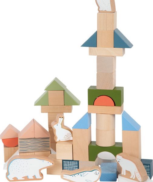 Klocki drewniane w kolorystyce błękitnej, miętowej, żółtej oraz naturalnego drewna. Komplet składa się z 50 drewnianych klocków w różnych kształtach i rozmiarach,