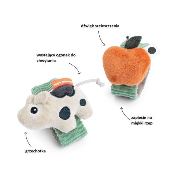 Ten uroczy zestaw grzechotek na nadgarstek jest idealny do wczesnego pobudzania zmysłów dziecka. Zawiera elementy sensoryczne, takie jak grzechotka, szeleszczący