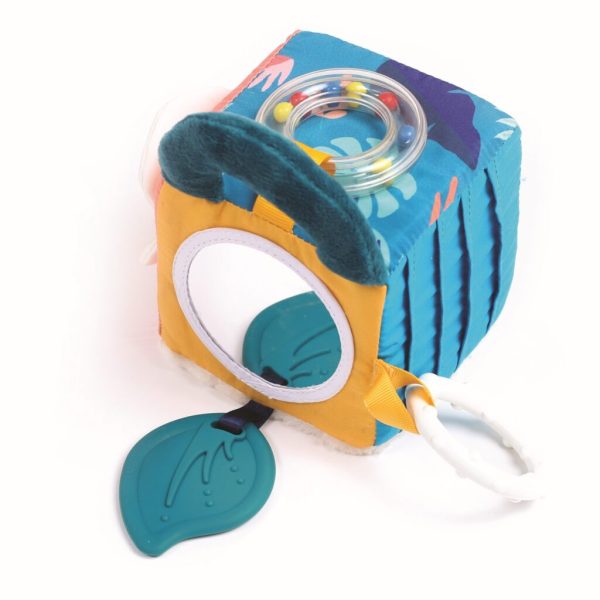Wykonana z materiałów o różnych teksturach. Kontrastowa kolorystyka i wystające, wielobarwne tasiemki wspomagają rozwój zmysłów dziecka. Świetna zabawka do nauki
