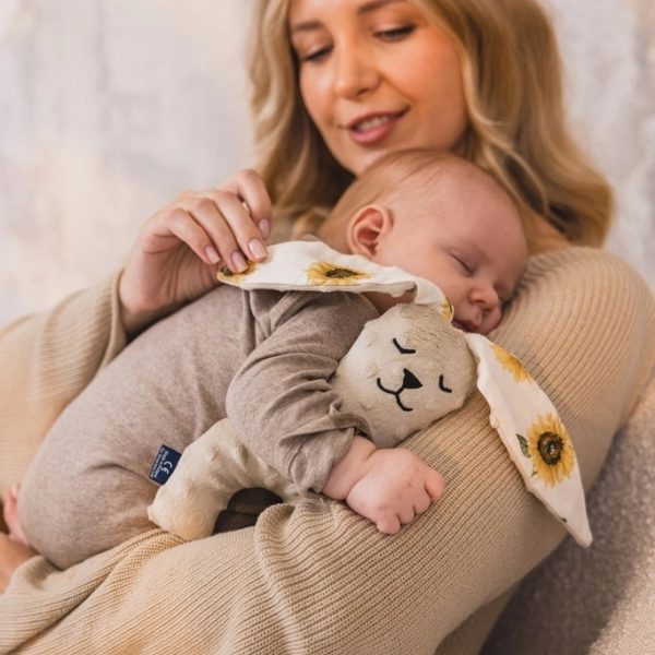 Mała papuga PALOMA pluszowa grzechotka w delikatnych kolorach, z przezroczystym plastikowym brzuchem i małymi kolorowymi kulkami. Wnętrze jej skrzydeł zawiera