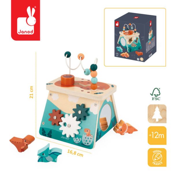 Drewniana wielofunkcyjna kostka aktywizująca z kolekcji Dinozaury francuskiej marki Janod rozwija u dziecka wiele kluczowych umiejętności, m.in. rozróżnianie i dopasowywanie