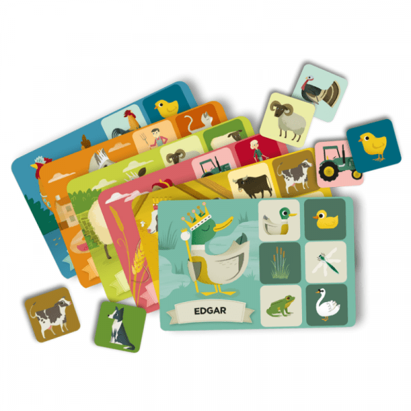 Gra lotto Na farmie od Auzou. Typowa gra w bingo – szukamy pasujących elementów. Gra składa się z 6 kart,