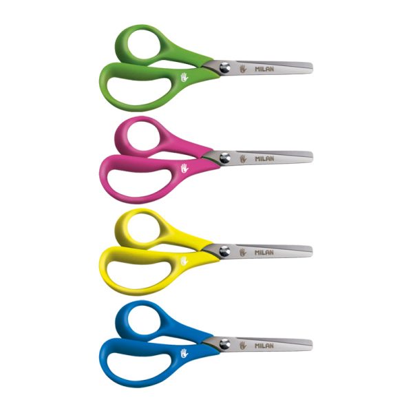 Nożyczki szkolne z ostrzem ze stali nierdzewnej z zaokrągloną końcówką. Wyprofilowane specjalnie dla osób leworęcznych. Długość 14,4 cm. Plastikowa rączka.