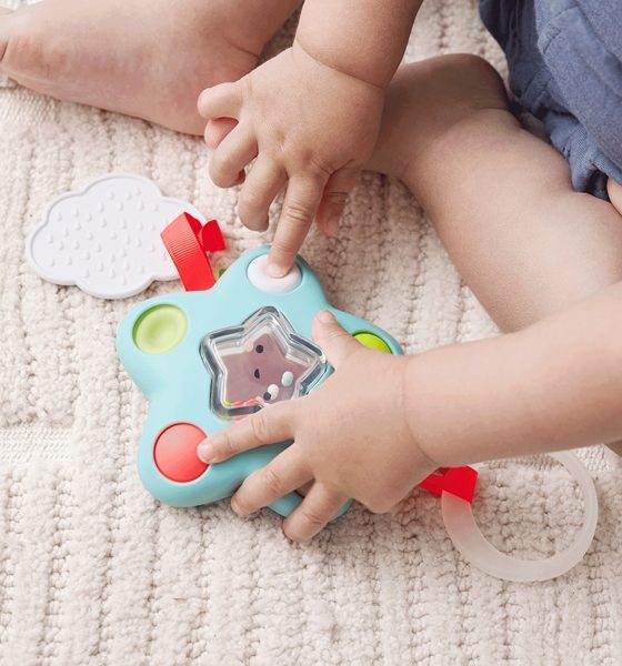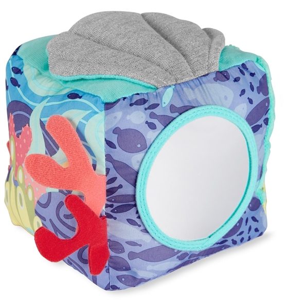 Miękka kostka do pierwszych zabaw sensorycznych w morskiej stylistyce. Kostka stworzona jest z różnych tekstur, posiada szeleszczące elementy oraz różne