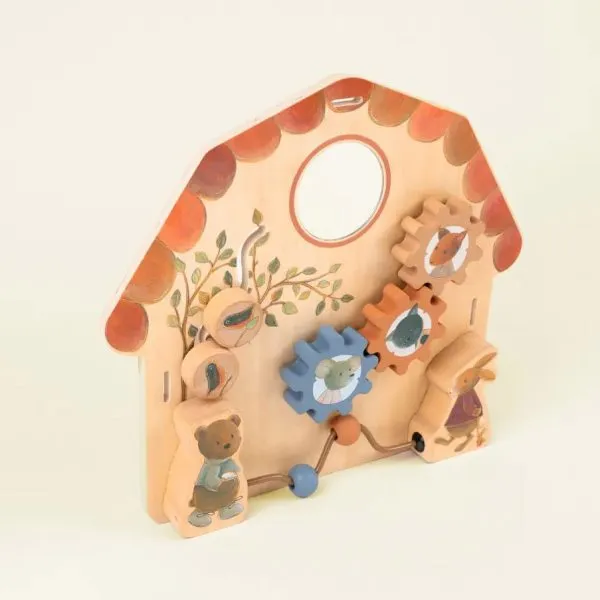 Drewniana gra zręcznościowa – tablica manipulacyjna dla najmłodszych. Niekończąca się zabawa w obracanie, przesuwanie i zaglądanie w lusterko. Doskonałe ćwiczenie
