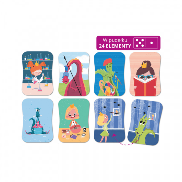 Królewny i smoki to gra memory pełna przygód smoków oswojonych przez nieustraszone królewny. Zadaniem najmłodszych jest znalezienie jak najszybciej wszystkich