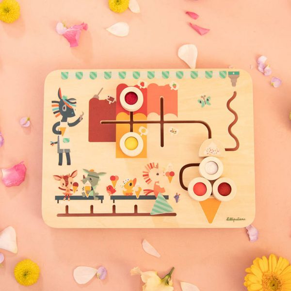 Tablica manipulacyjna – gra kompozycjna Lodziarnia belgijskiej marki Lilliputiens to niebanalne wielofunkcyjne źródło rozrywki i nauki dla ciekawskich maluszków. Na