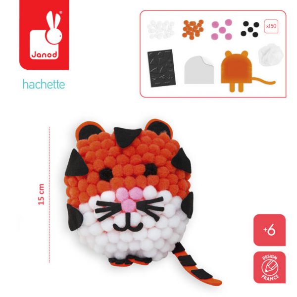Zestaw kreatywny Mini-pompony Tygrys francuskiej marki JANOD zawiera 150 mini-pomponów w kolorach białym, czarnym i pomarańczowym, wycięty z filcu kształt
