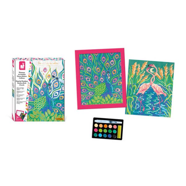 Zestaw kreatywny Malowanie po numerach Wspaniałe ptaki francuskiej marki JANOD zawiera 2 plansze-obrazki z tymi stworzeniami: parą flamingów w szuwarach