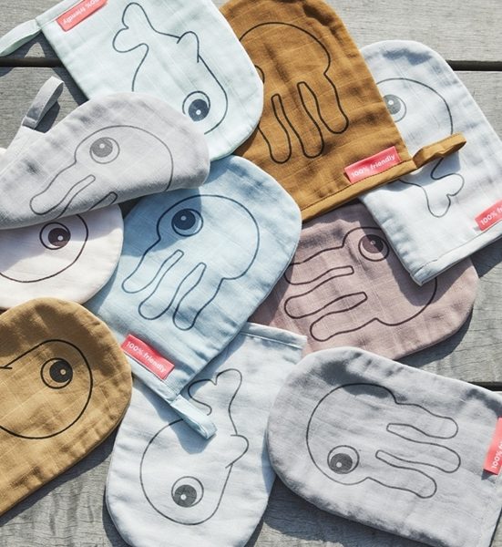 Zestaw dwóch miękkich wielowarstwowych myjek muślinowych w pasujących do siebie kolorach ozdobionych motywem znanych już morskich przyjaciół Done by Deer.