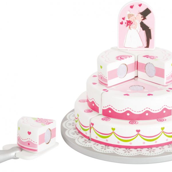 Niezwykle smakowicie wyglądający drewniany tort ślubny idealny na dziecięce zabawy w odgrywanie ról. Świetnie sprawdzi się na niejednym przyjęciu. Tort