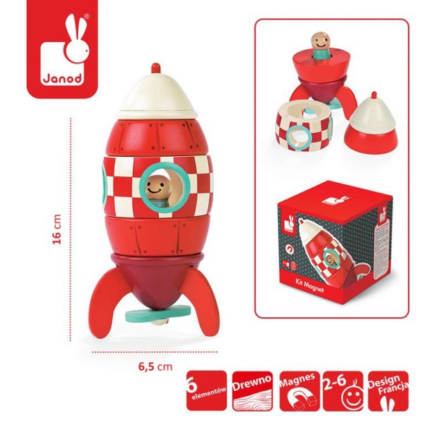 Rakieta magnetyczna to najbardziej rozpoznawalna zabawka francuskiej marki Janod! Spełnia marzenia wielu dzieci o lataniu w kosmos! Zestaw 6 drewnianych